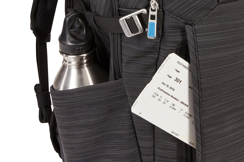 - Store small items or a laptop cable in the zipped side pocket and fit a water bottle in the expandable open side pocket